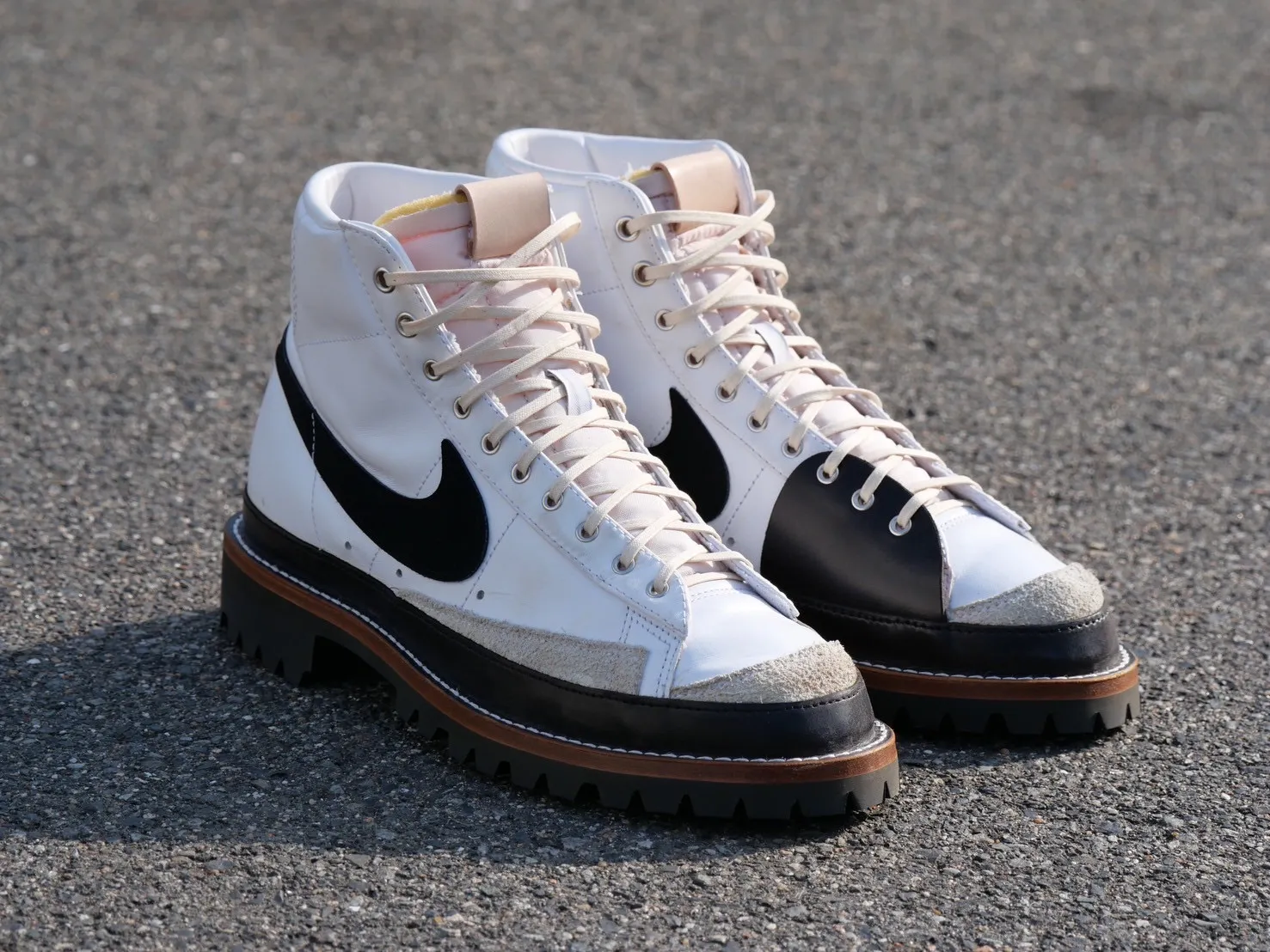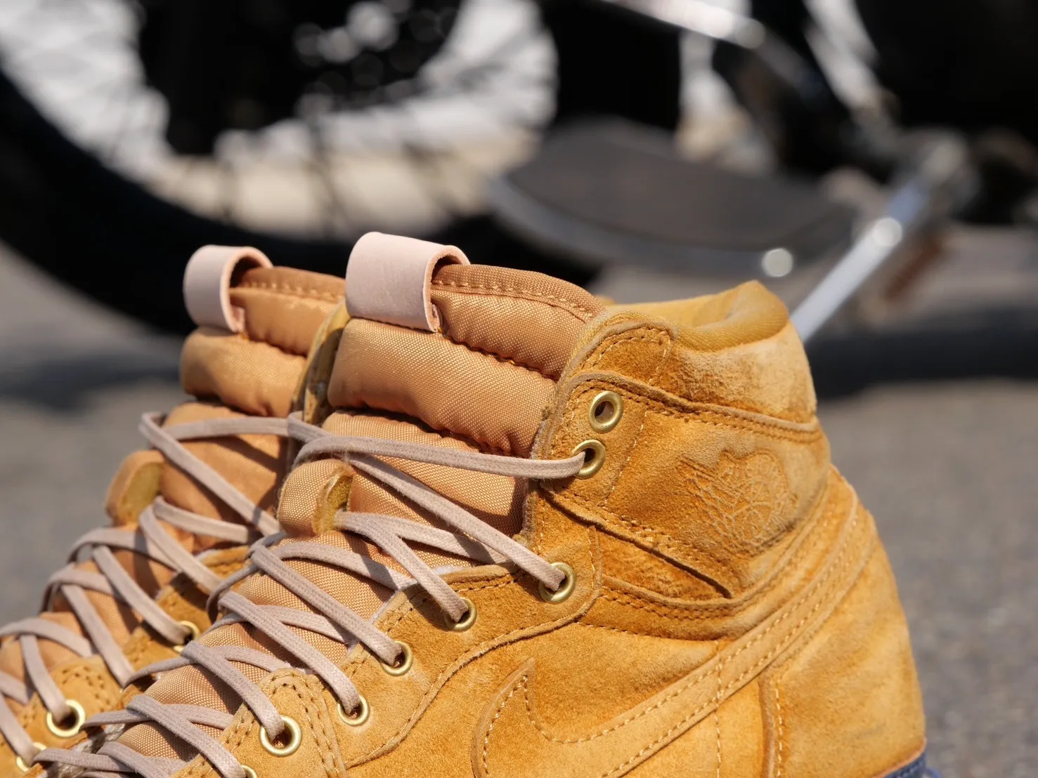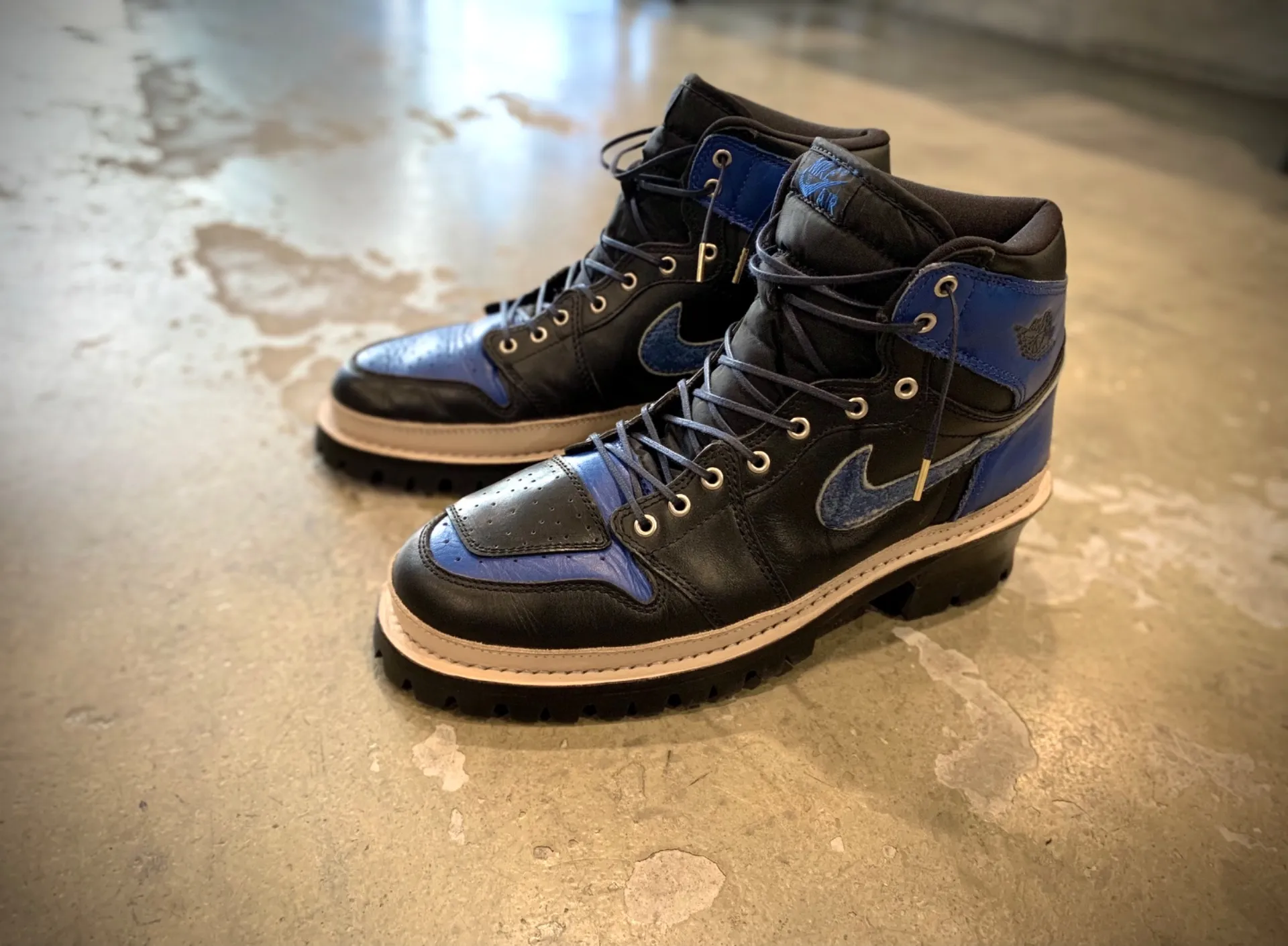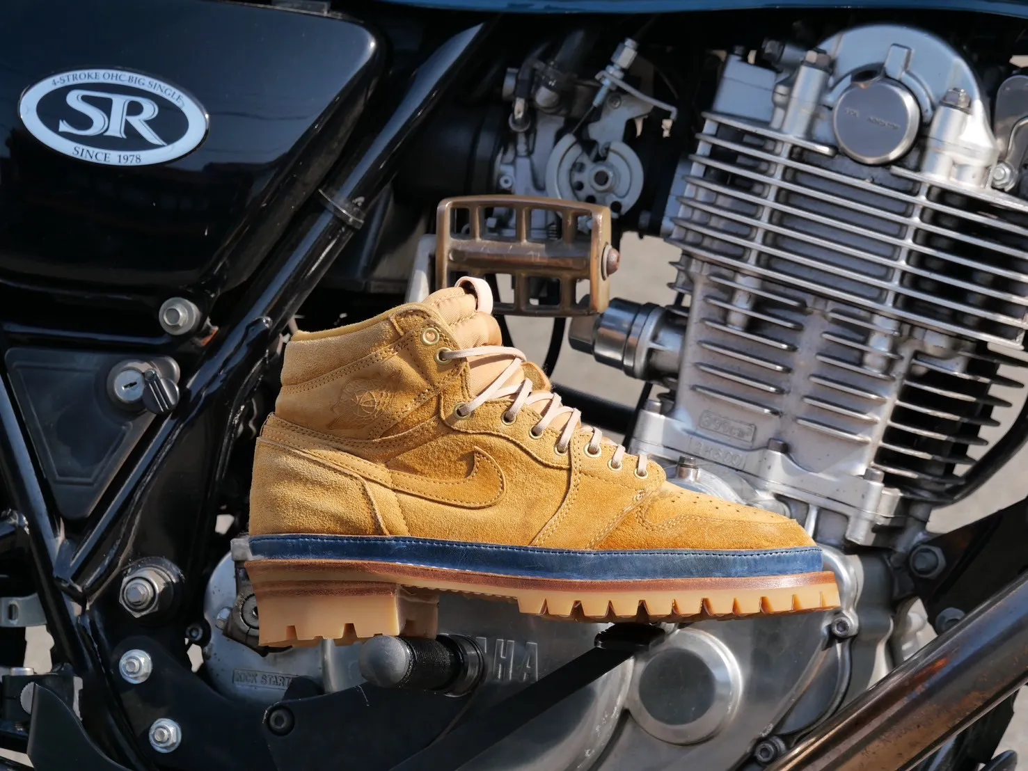 「よし!ないなら作ればいいや!」となり、数年前、仕事で知り合った靴職人さんに依頼し、当時観賞用にしていた2001年製 AIR JORDAN1 通称ROYALをベースにバイクに特化したスニーカーブーツ作りが始まりました!