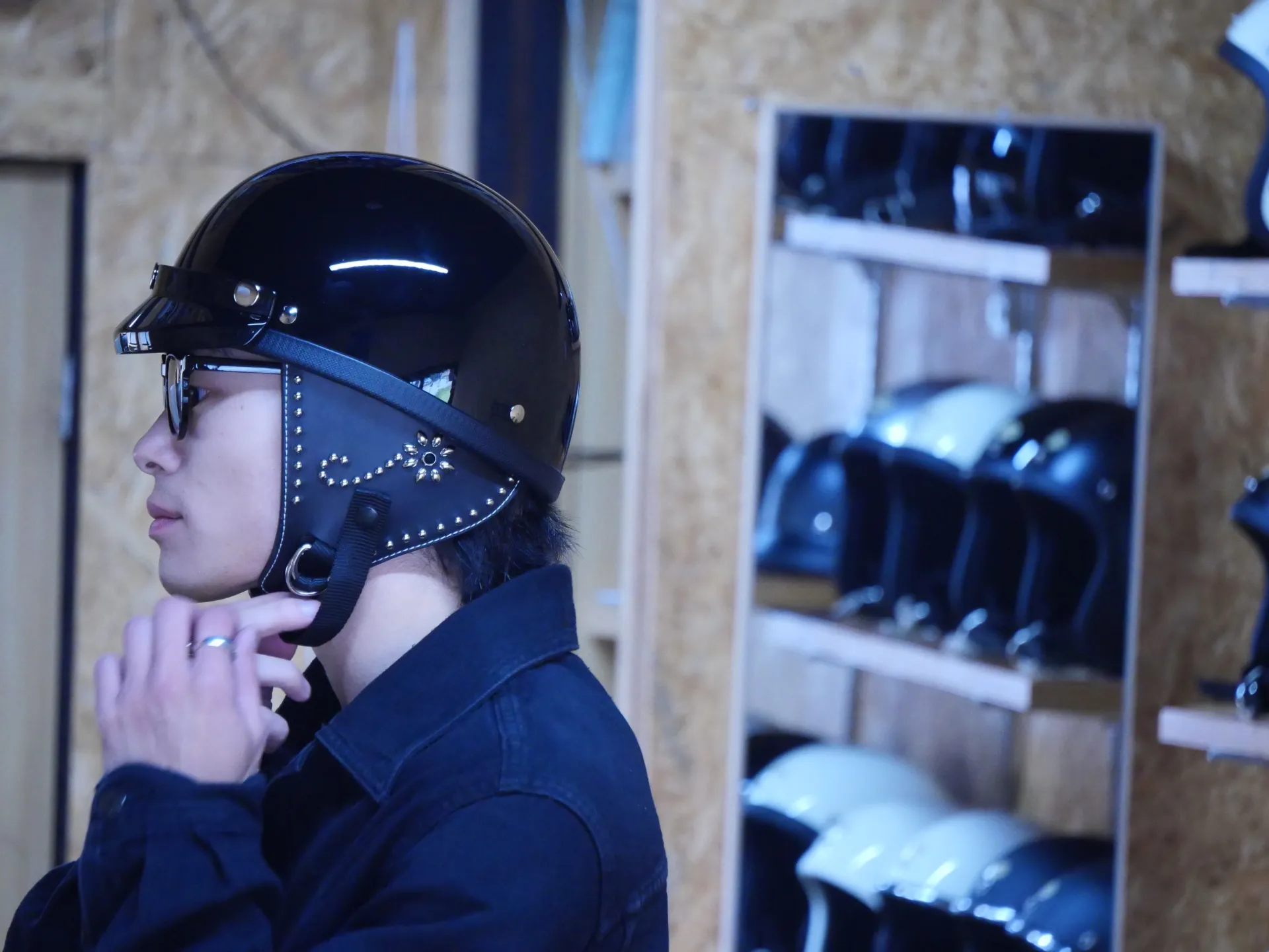 クラシックなヘルメットにちょっとしたアクセントのズタッズが効いてます!