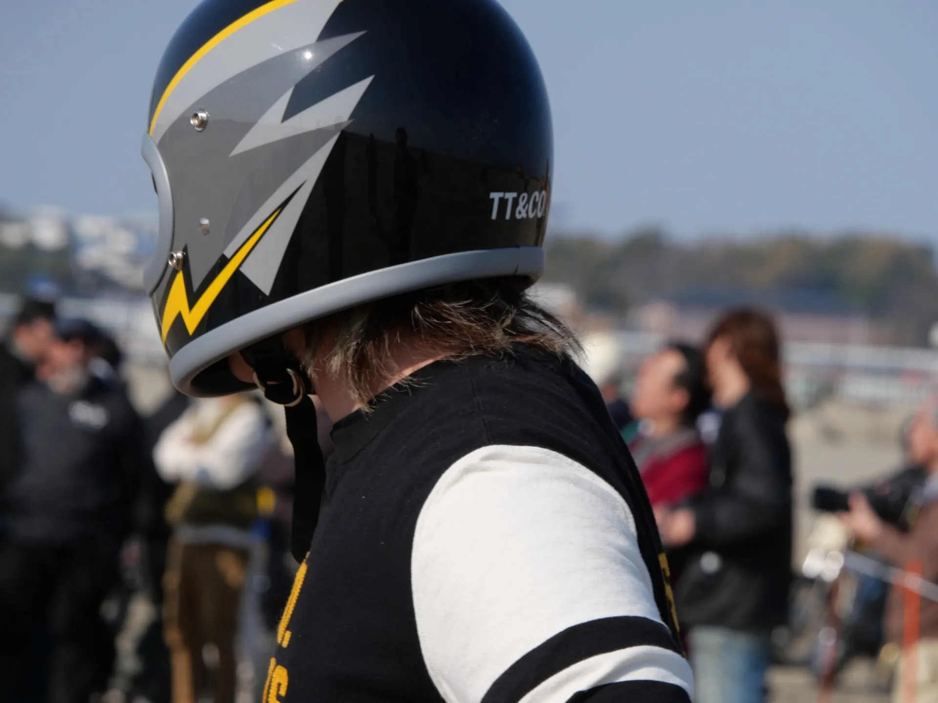 ヴィンテージ車両に合わせたクラシックなヘルメットが多い中で、敢えてレーシーなヘルメットに!