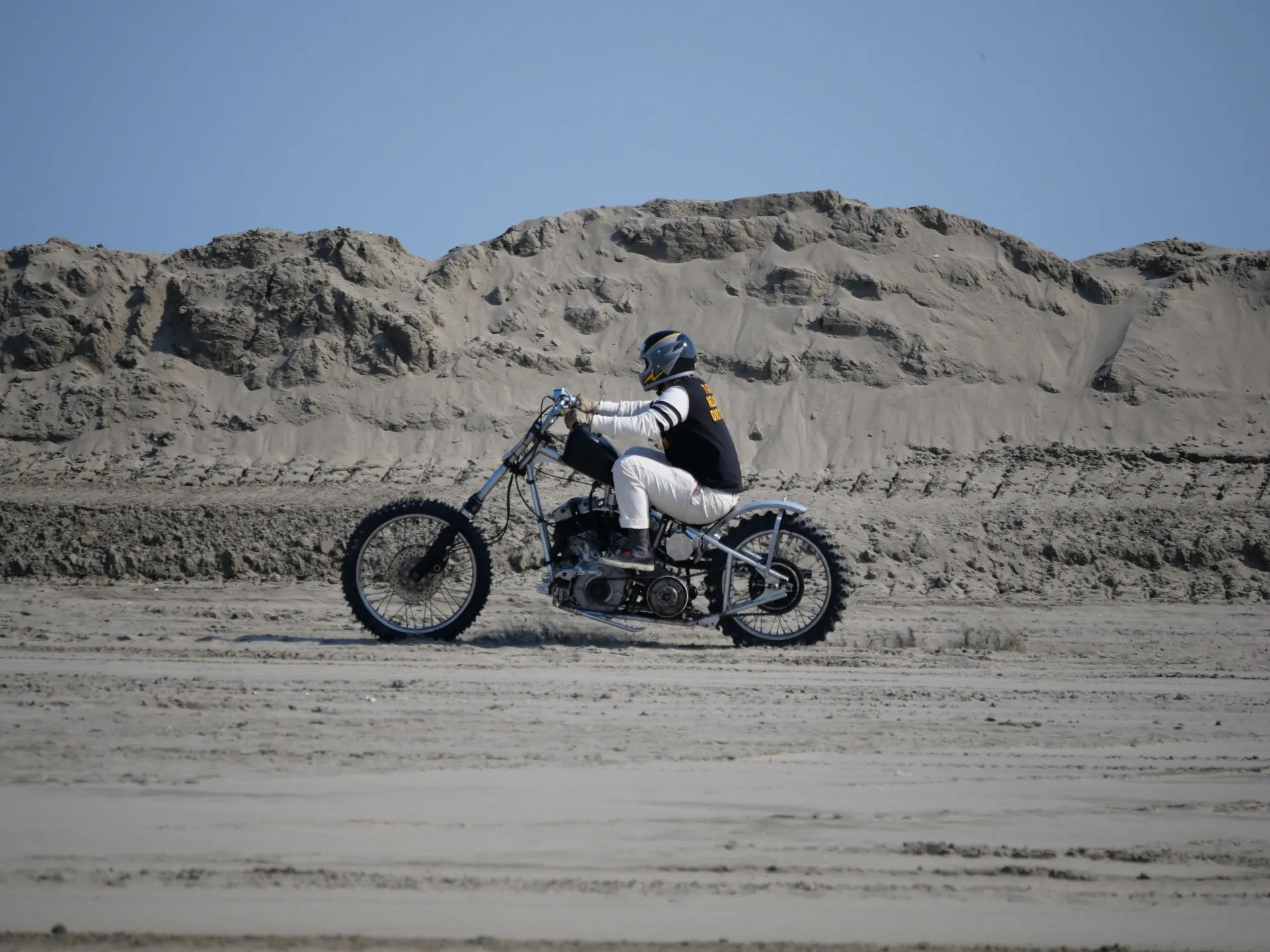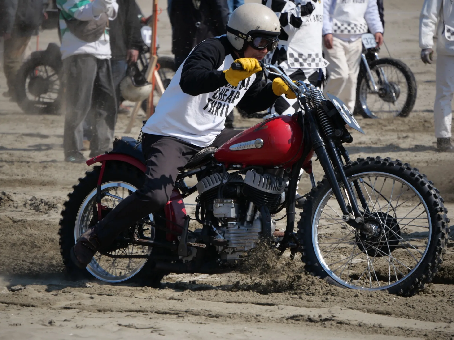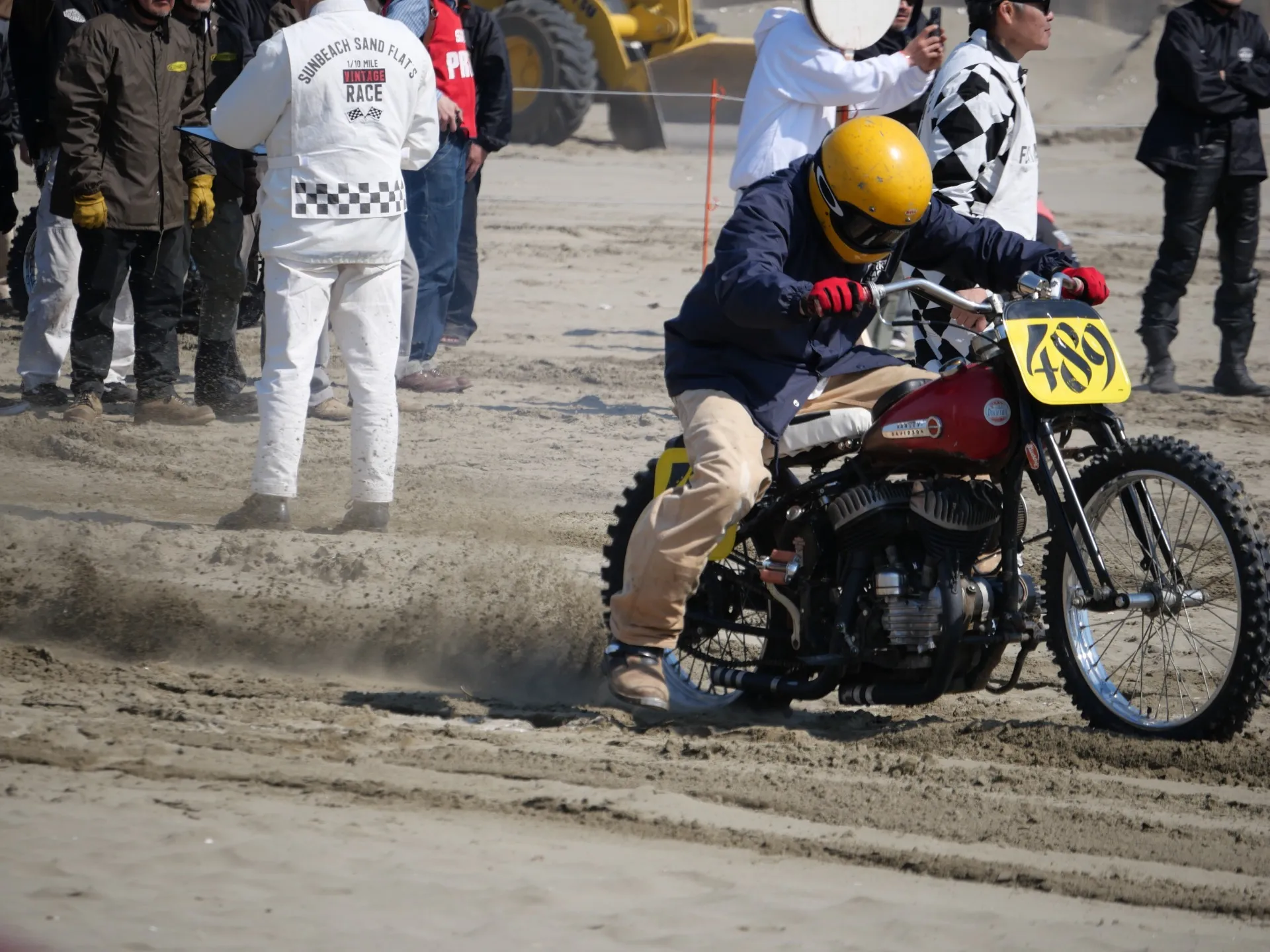 年式別・エンジン別に分けられたレーサー達が砂浜に集結し、爆音とともに走り出す光景は圧巻の一言。